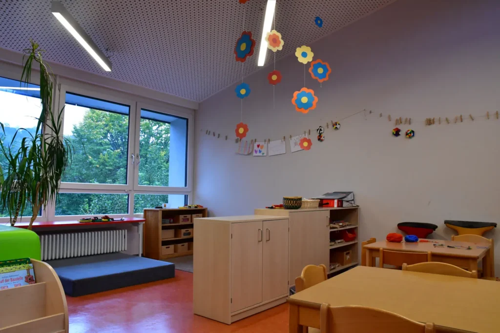 Unser dreigruppiger Kindergarten bietet Betreuungsplätze für 50 Kinder im Alter von 3-6 Jahren und für 10 Kinder von 1-3 Jahren.